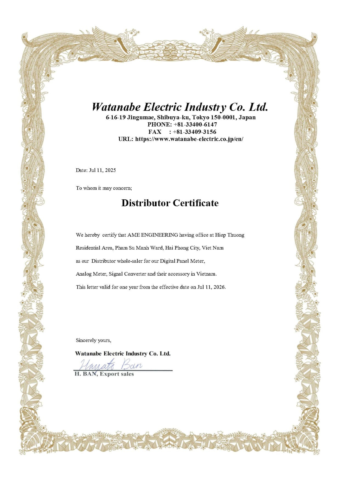 CHỨNG CHỈ NHÀ PHÂN PHỐI ỦY QUYỀN SẢN PHẨM WATANABE JAPAN